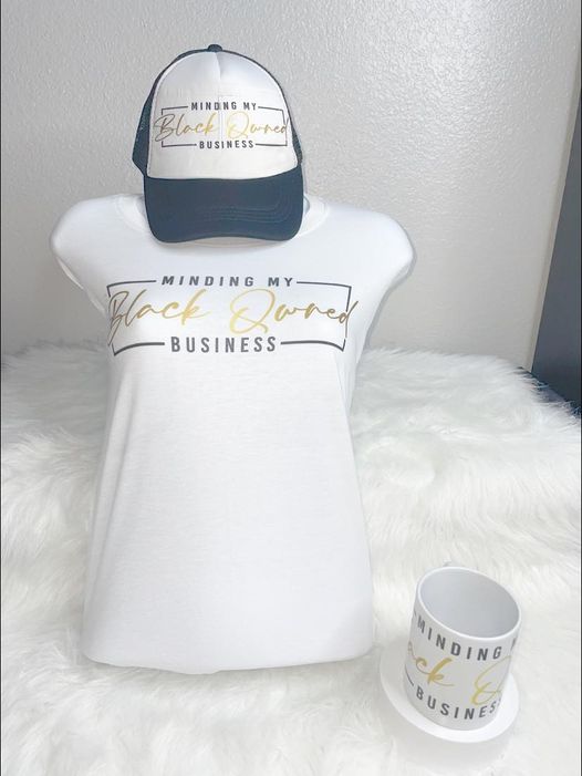Minding My Black Owned Business Sublimated Designed comes with Shirt, hat, and Mug